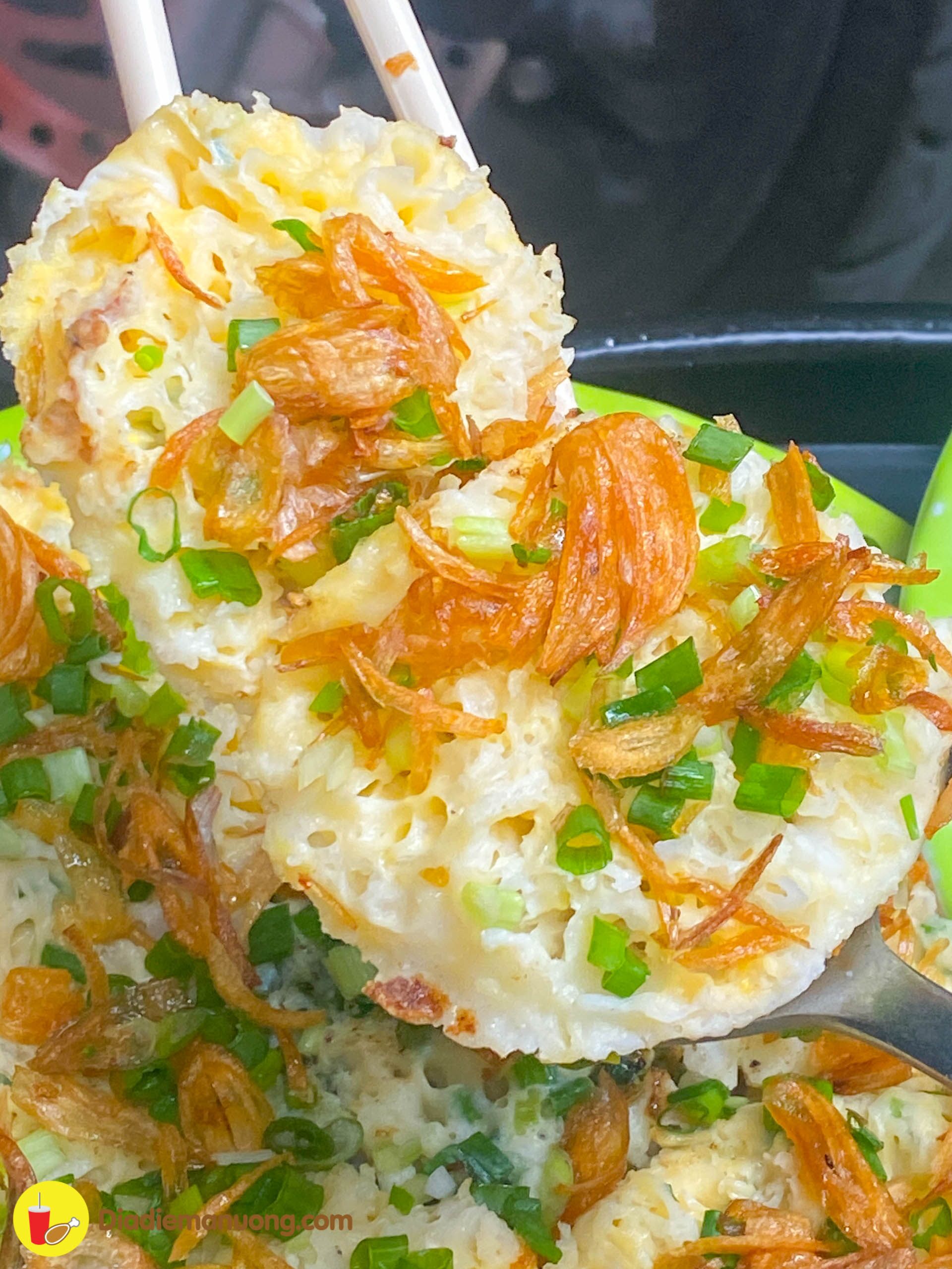 Bánh của má đổ ta nói đỉnh của chóp luôn á, chiếc bánh không quá dày cũng không quá mỏng, đế giòn giòn còn bên trên mềm xốp nóng hổi.