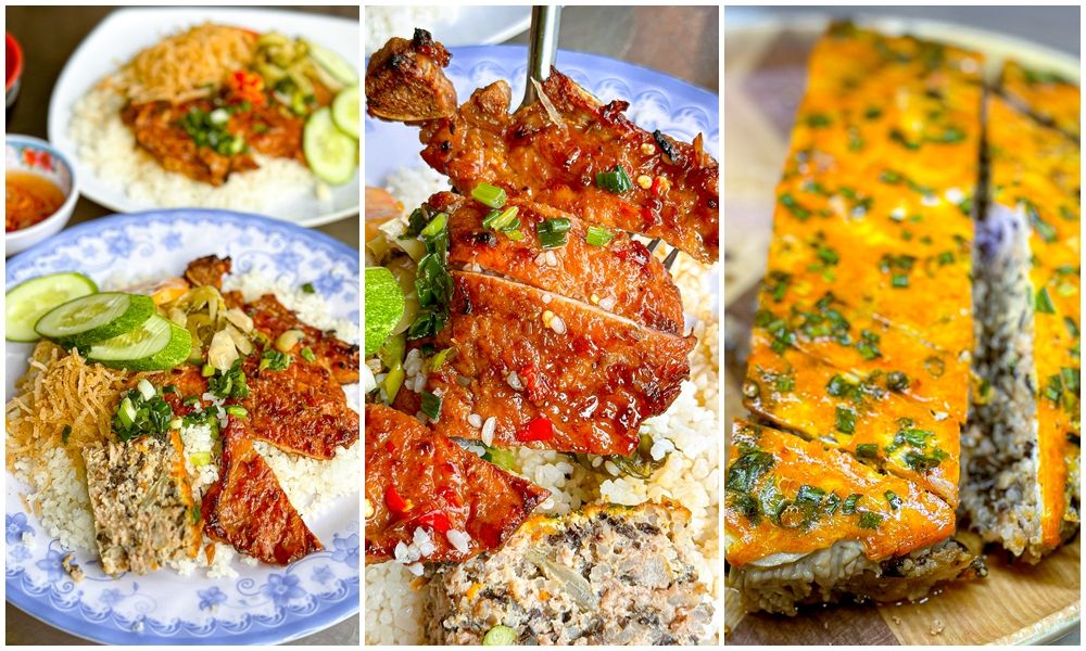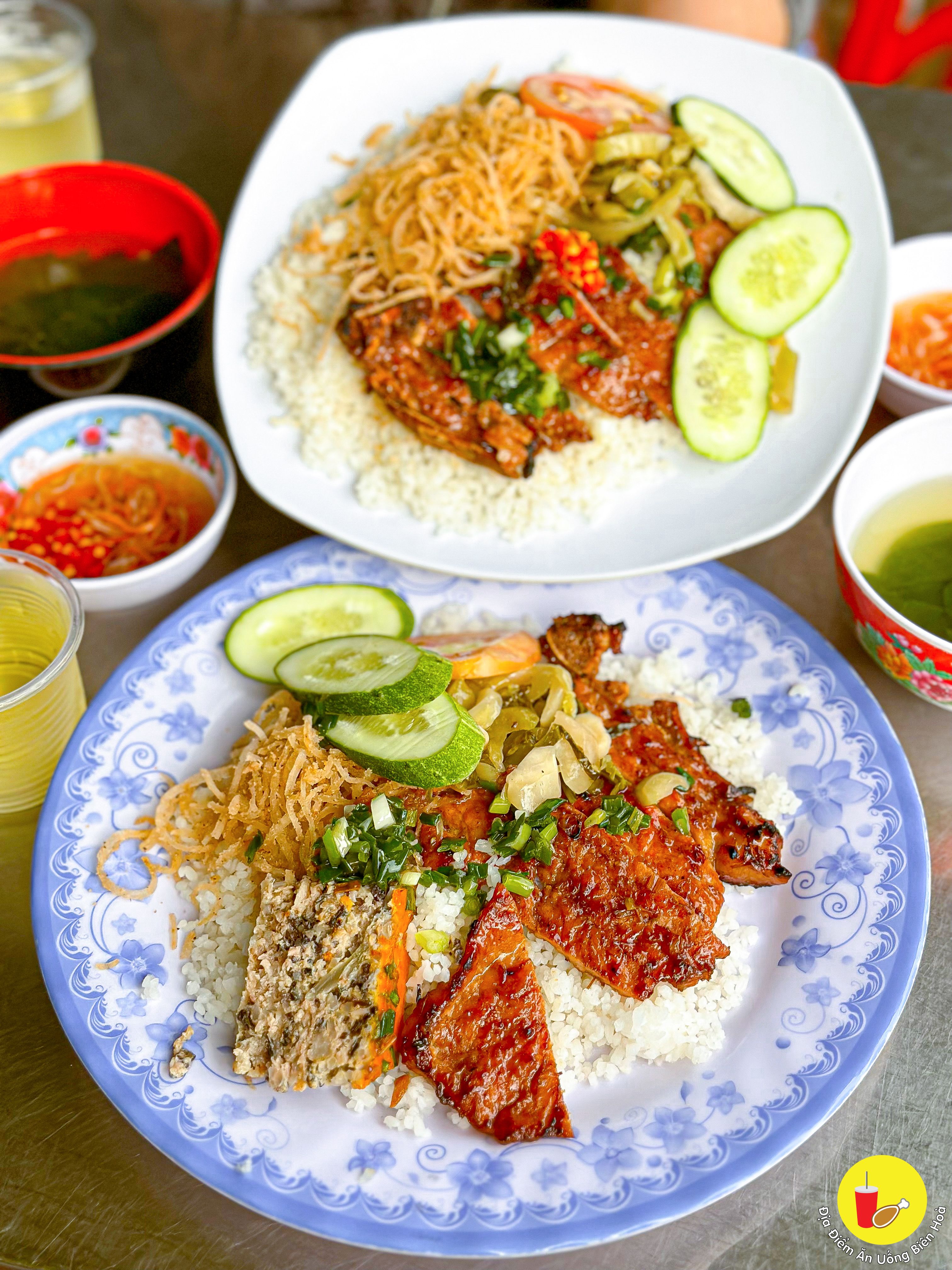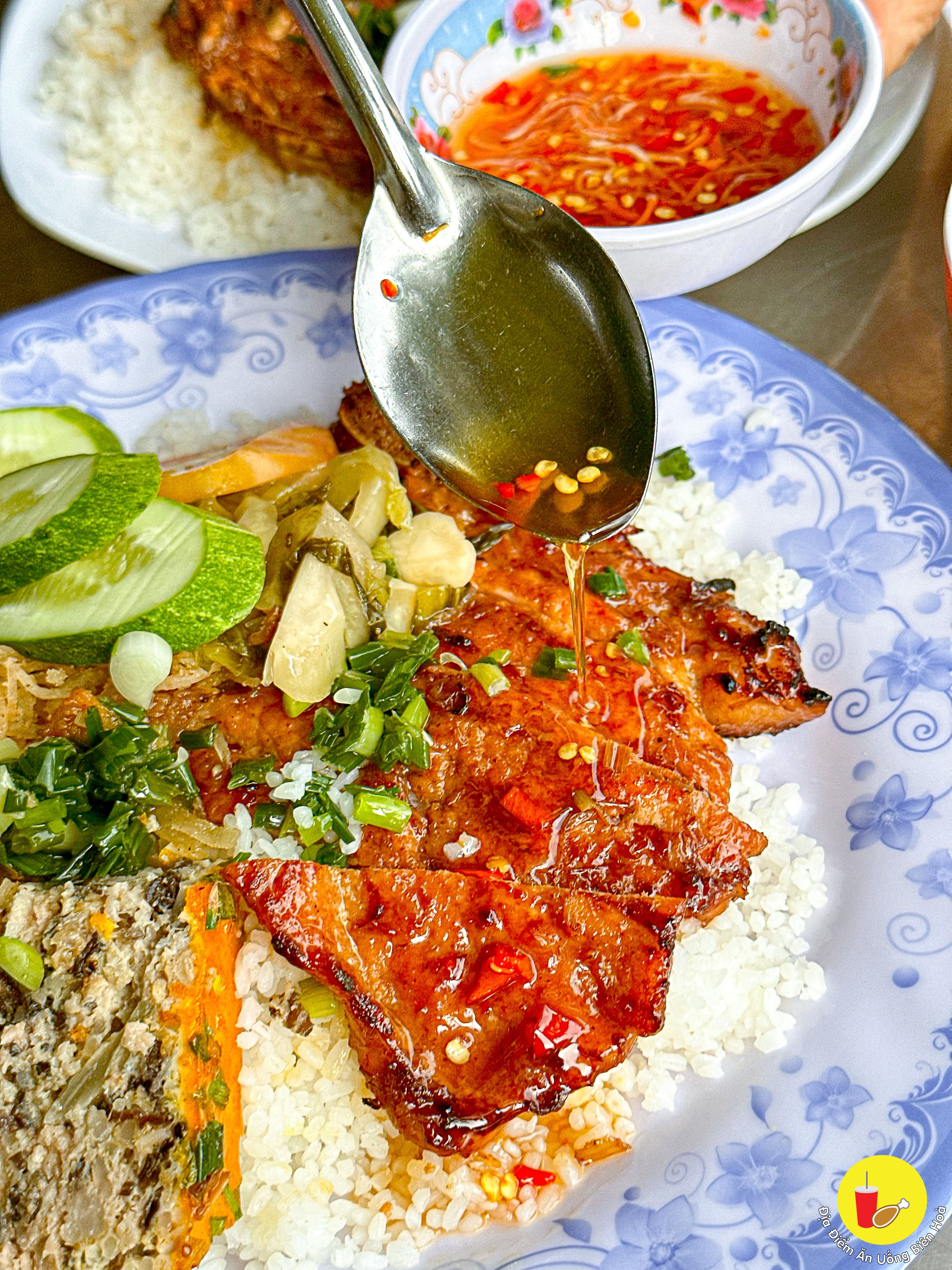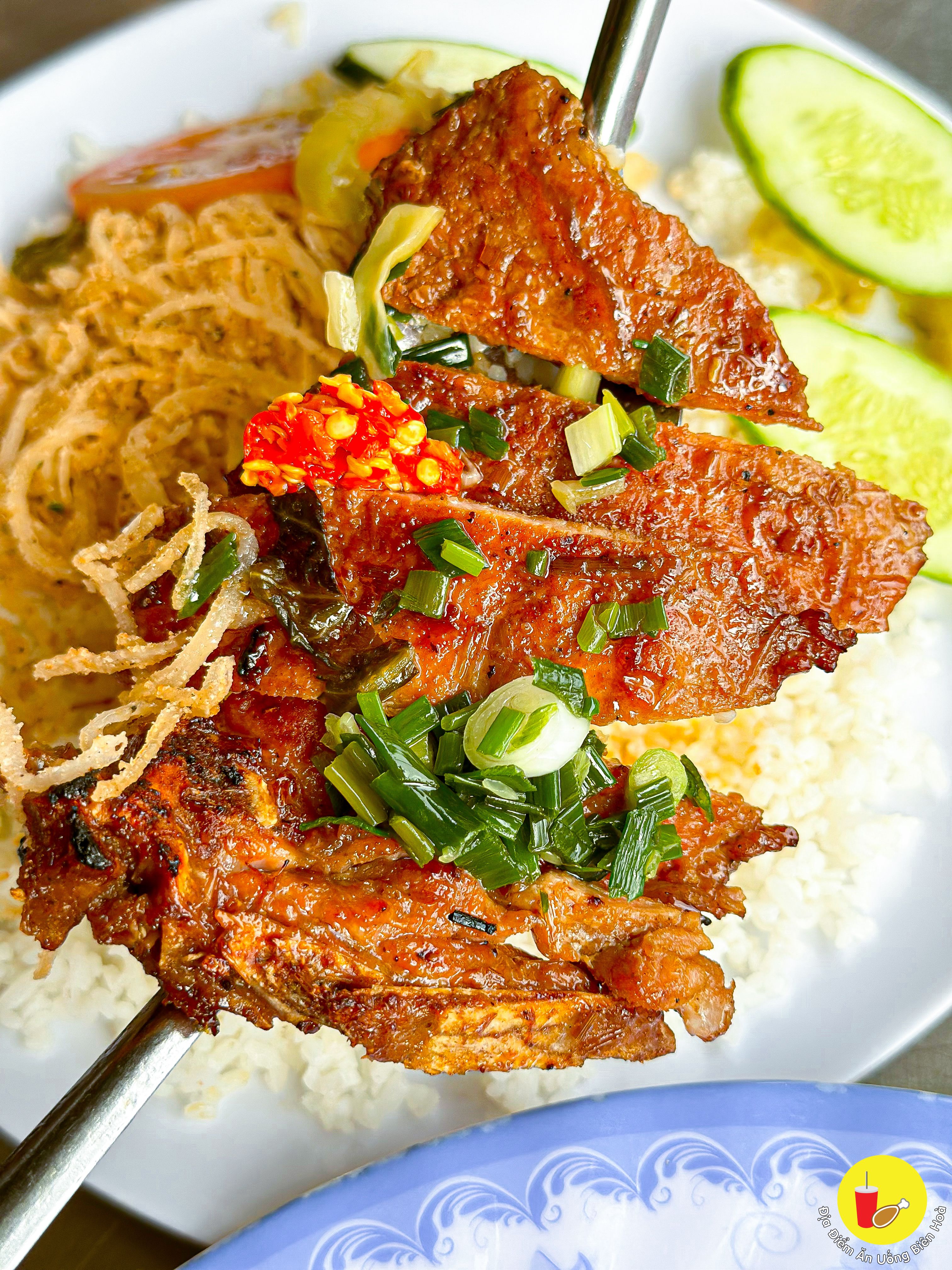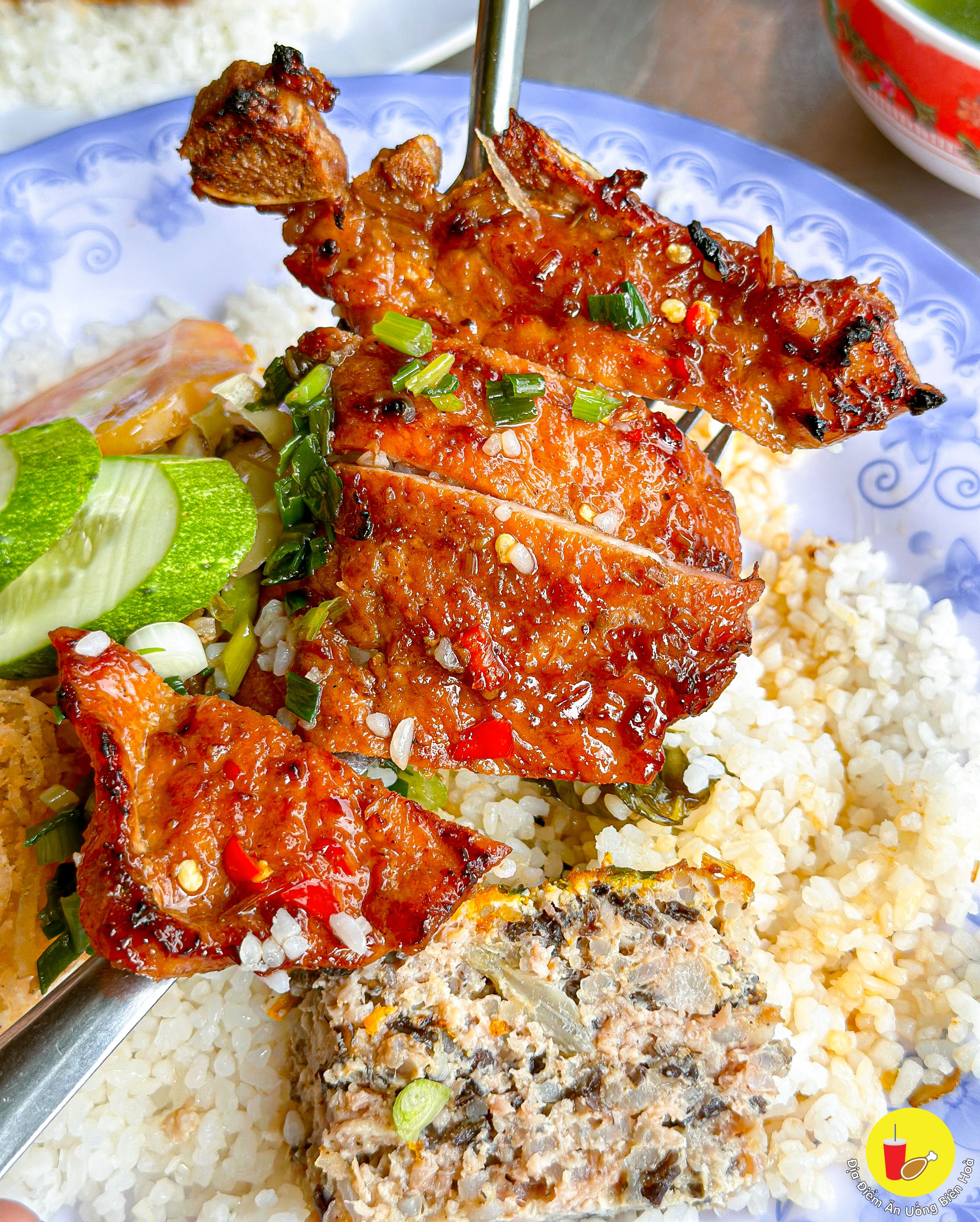 Sườn ướp đậm vị, nướng màu đẹp, thơm phức. Chén mắm pha vừa vặn, đồ ăn kèm như bì hay chả trứng hấp dẫn. Lại còn có thêm chén canh ăn kèm.