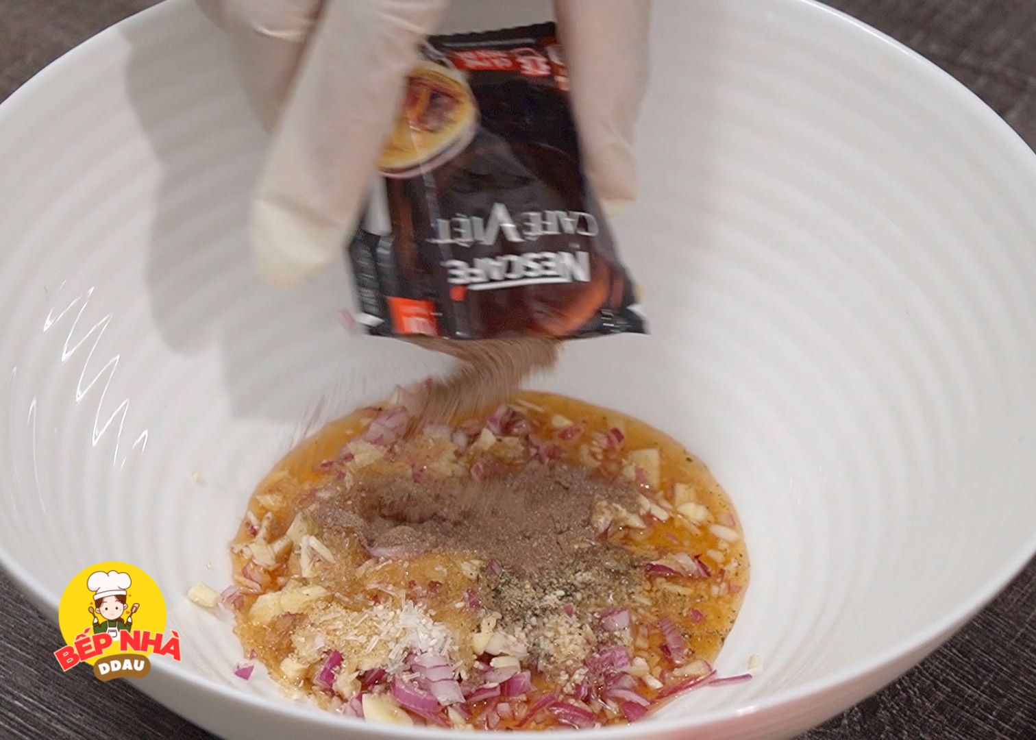 Pha hỗn hợp ướp giò gồm: ½ lượng hành tỏi băm đã chuẩn bị + 1m đường vàng + 1m hạt nêm + ⅓mcp bột ngọt + ½mcp tiêu xay + 5m nước mắm và ½ gói cà phê đen hòa tan, trộn lên cho thật đều.