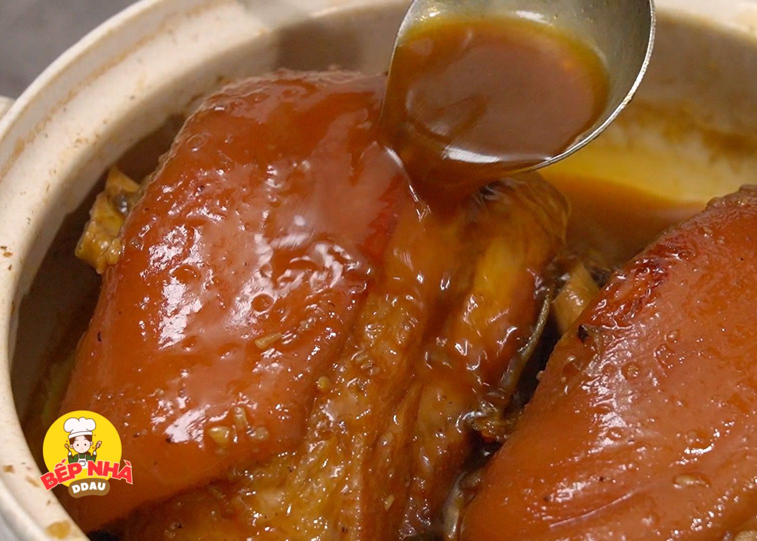 Chúng ta sẽ kho đậy nắp và lâu lâu vớt bọt để nước kho được trong, thường xuyên trở mặt giò để giò thấm đều gia vị nha các bạn. Khi nước rút xuống còn ⅓ lượng ban đầu thì giò cũng đã chín vừa ăn.
