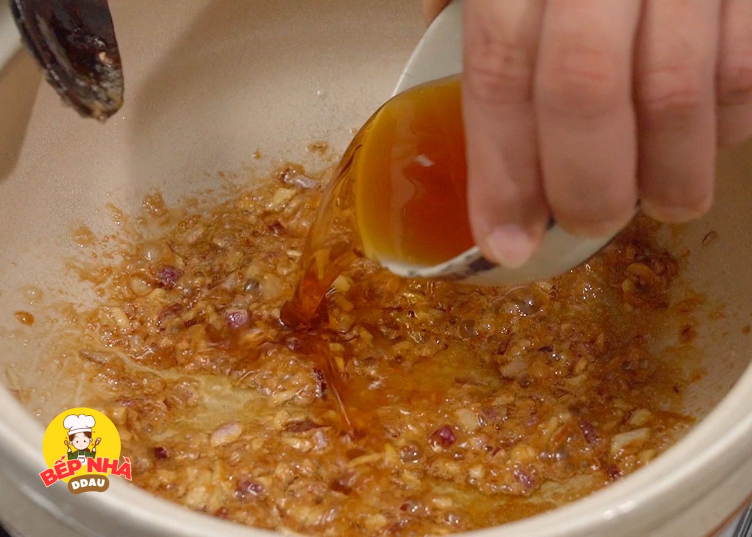 Chúng ta thắn nước màu với tỷ lệ 2m dầu ăn + ½ lượng hành tỏi băm đã chuẩn bị + 2m đường vàng. Xào đều trên lửa vừa đến khi hỗn hợp chuyển màu nâu caramel đẹp mắt thì cho tiếp ½ chén nước mắm + nước dừa tươi vào.