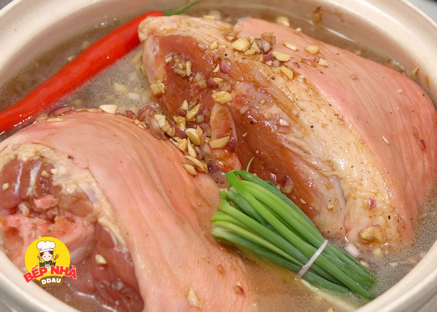 Nhẹ nhàng xếp giò heo đã ướp cùng hỗn hợp nước ướp vào nồi nước dừa tươi vừa chuẩn bị, thêm vào 1 trái ớt sừng và 3 cây hành lá cho giò heo khi hoàn tất được thơm hơn.