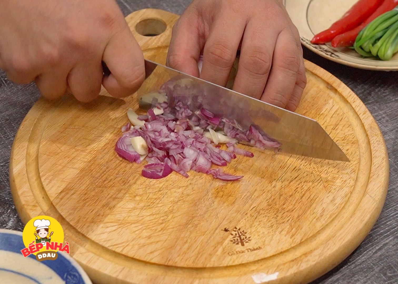 Ngoài hành lá và ớt sừng, các bạn cần bằm thêm 5 tép tỏi và 5 củ hành tím để kho cùng giò heo giúp giò thơm ngon và đậm đà hơn.