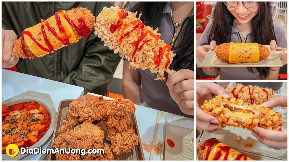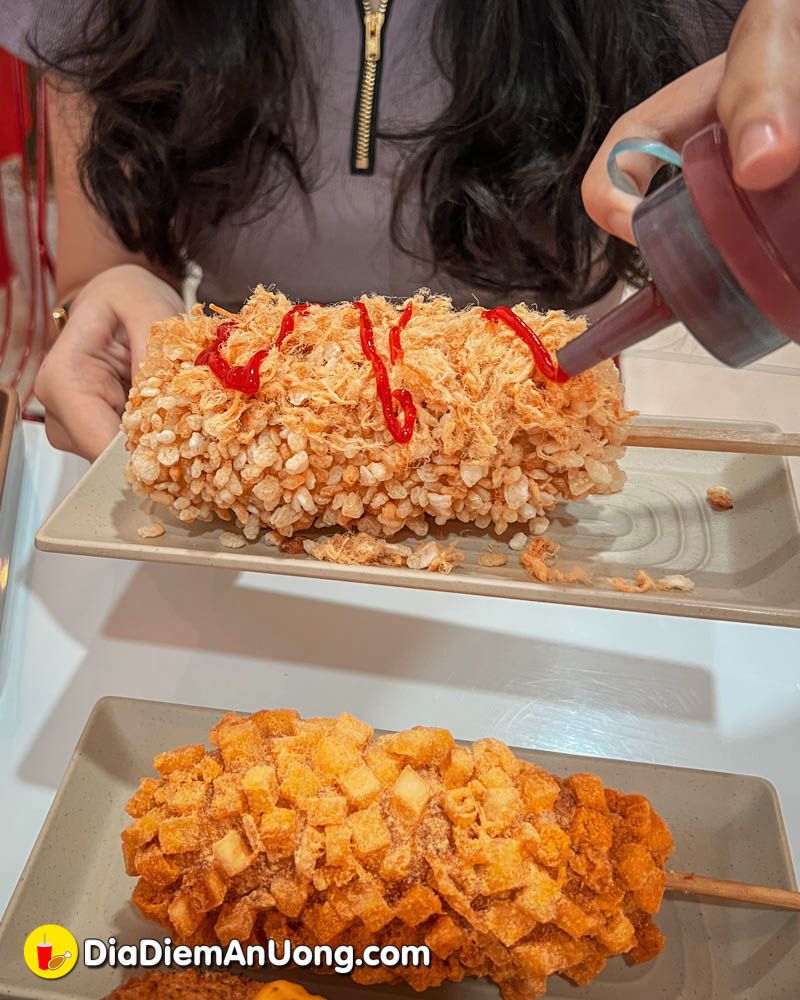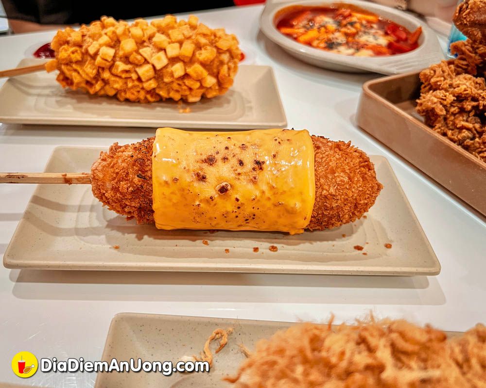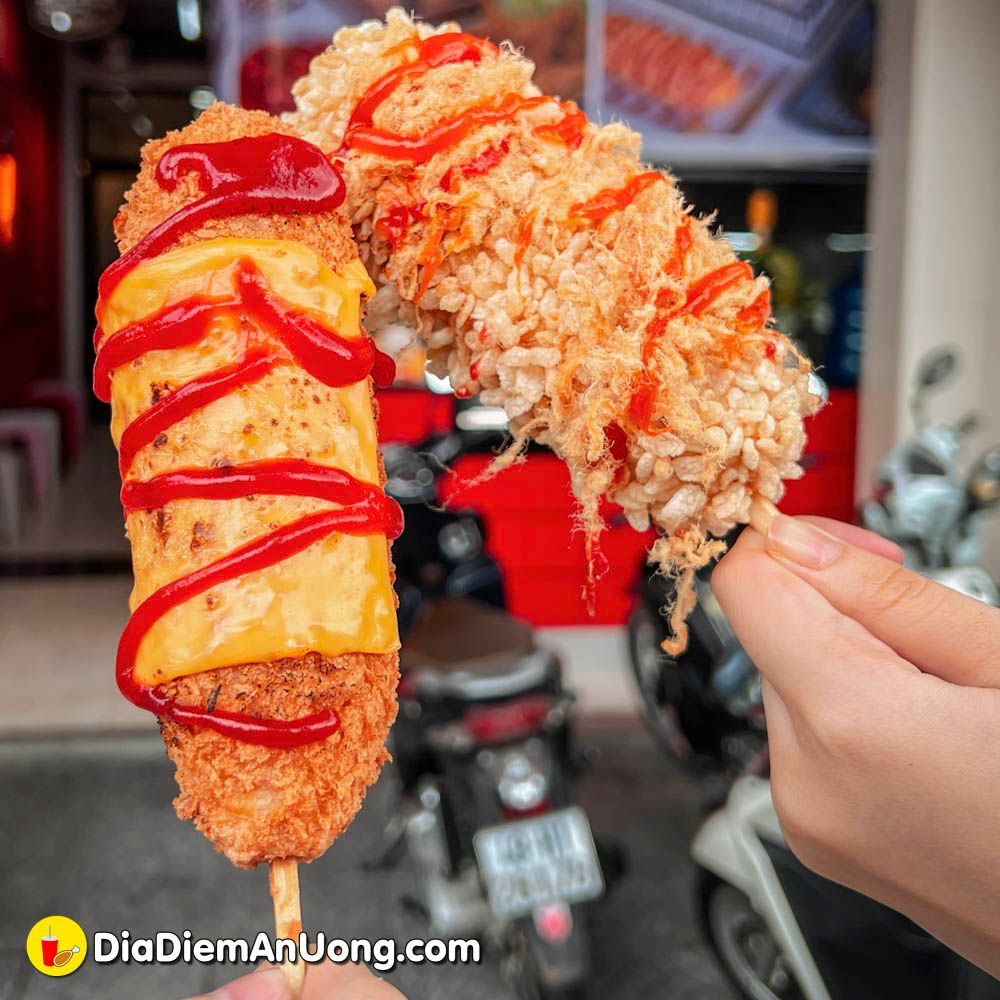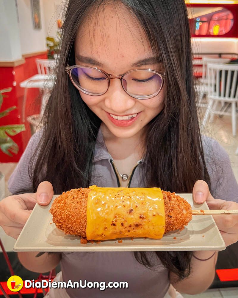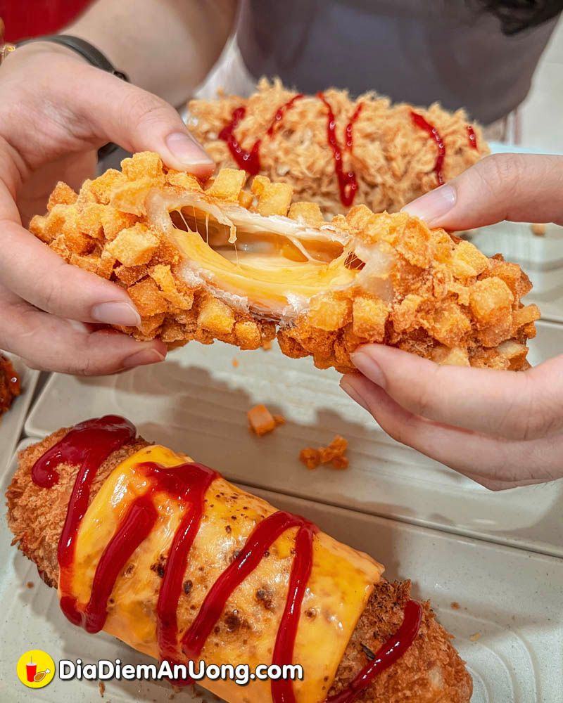 Phần này thì chỉ dùng duy nhất phô mai Cheddar và xúc xích nên vị dai thơm chứ không quá béo ngậy như Mozzarella. Bạn đặc biệt phải thử cái topping cốm vàng chà bông nha vì tạo thêm độ mặn mà cho món Hotdog làm ăn hoài phô mai cũng không bị ngấy.