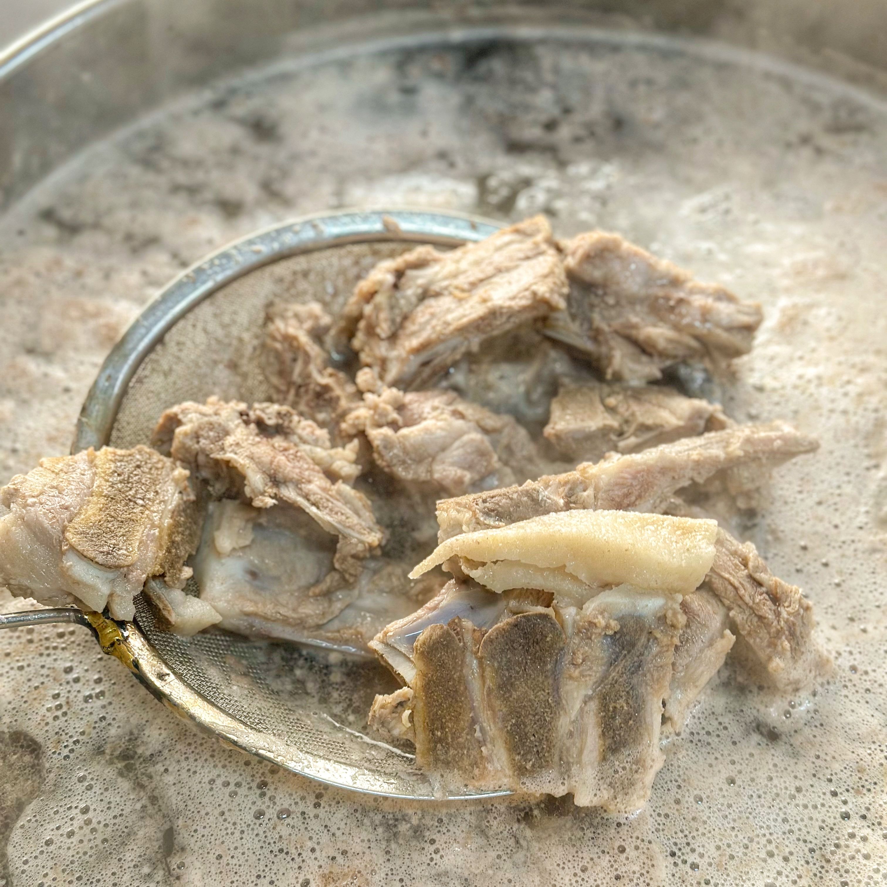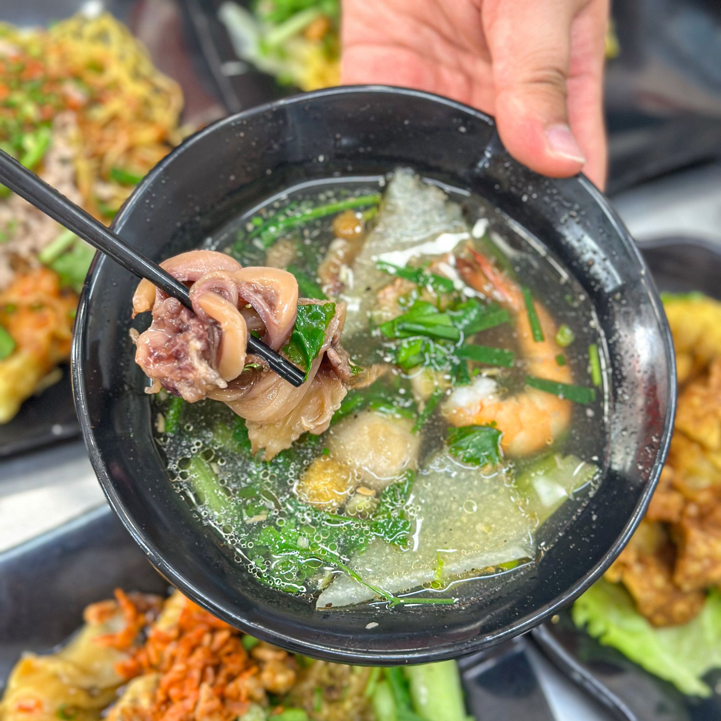 Cứ mỗi phần mì cảo quán sẽ tặng kèm 1 cục xí quách to cho khách. Nước lèo ăn với cảo hay mì nước có vị rất ngọt do xương ống tiết ra. Xí quách được tặng vừa có thịt, gân và tủy ăn không bị ngán.