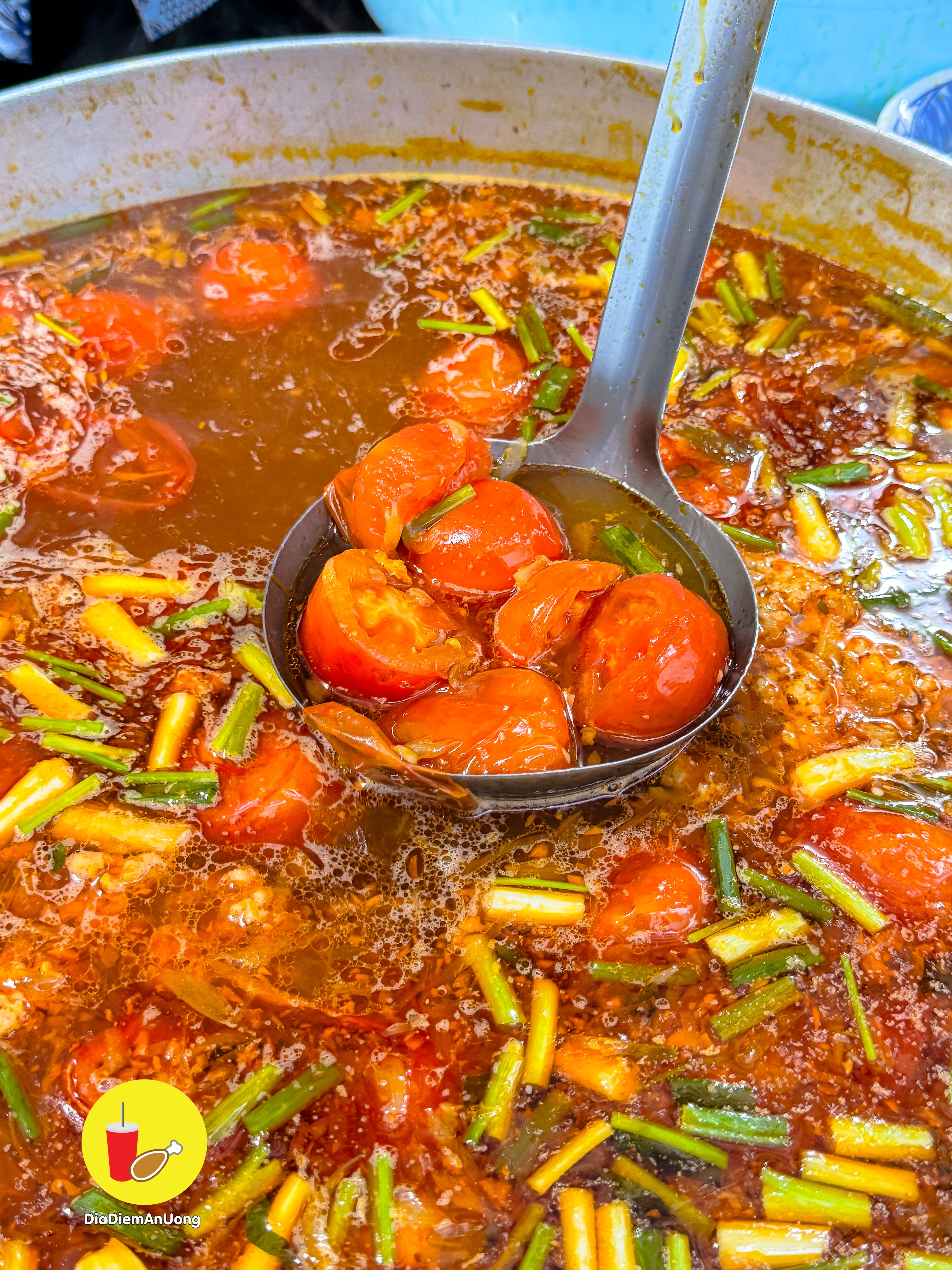 Giá một tô bình dân như vậy là 30K. Bún Riêu ở đây không hề có riêu, thay vào đó là ăn cùng cà chua, tôm khô, tóp mỡ là chủ yếu.