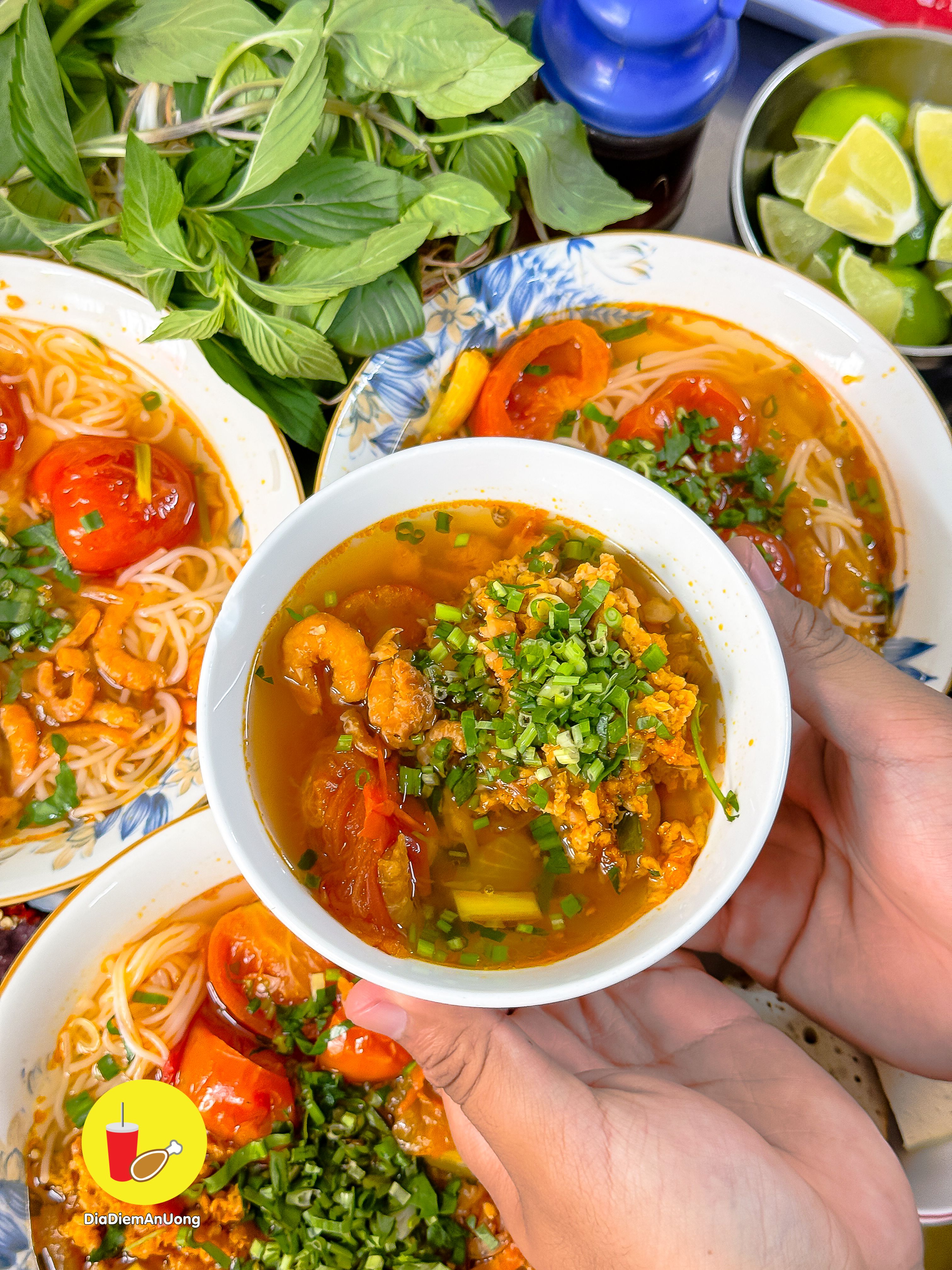 Một tô bún như hình sẽ bao gồm những nguyên liệu quen thuộc như tôm khô, cà chua, bún tươi và một chút tóp mỡ. Nước dùng ở đây trong veo, ít mỡ và dậy mùi thơm đặc trưng của cà chua, tôm khô.