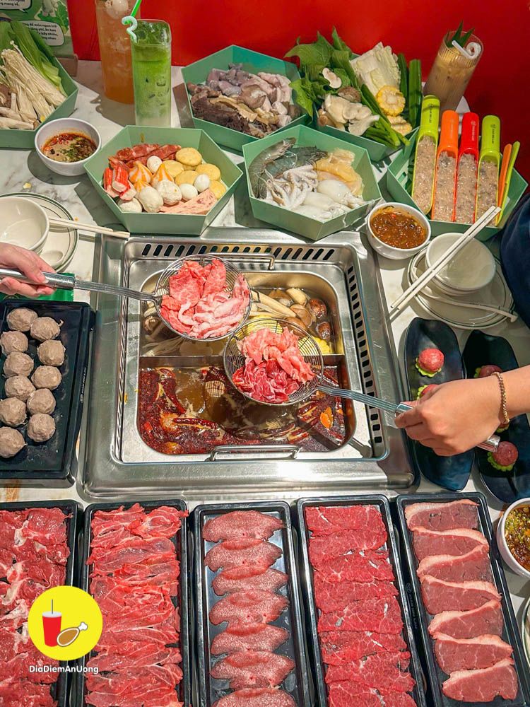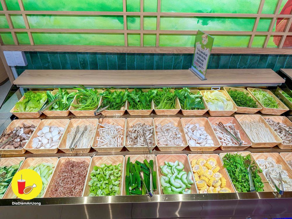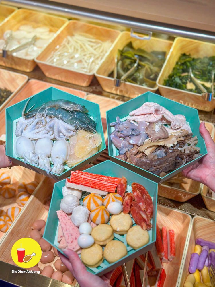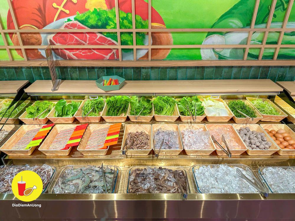 Khu vực các quầy line ta nói ê hề các loại từ thịt, lòng, các viên thả lẩu,....cho đến rau, nấm và đồ tráng miệng