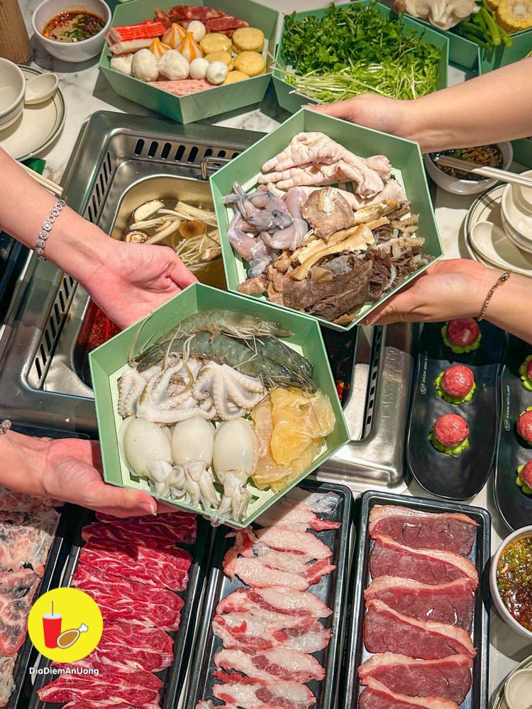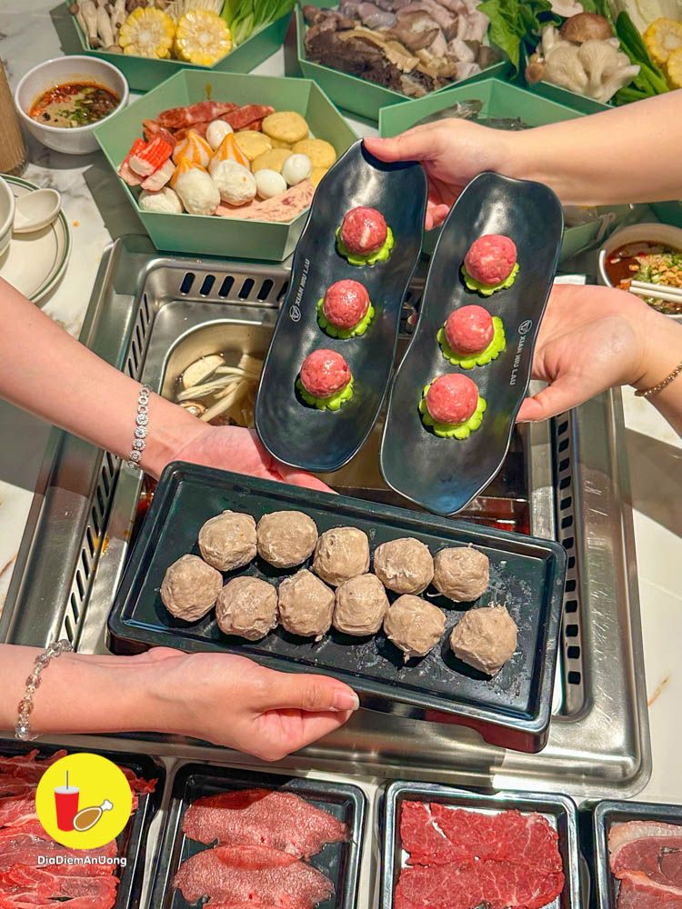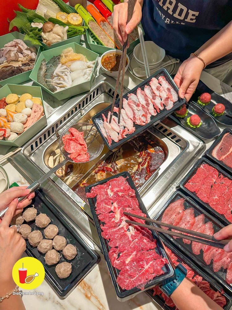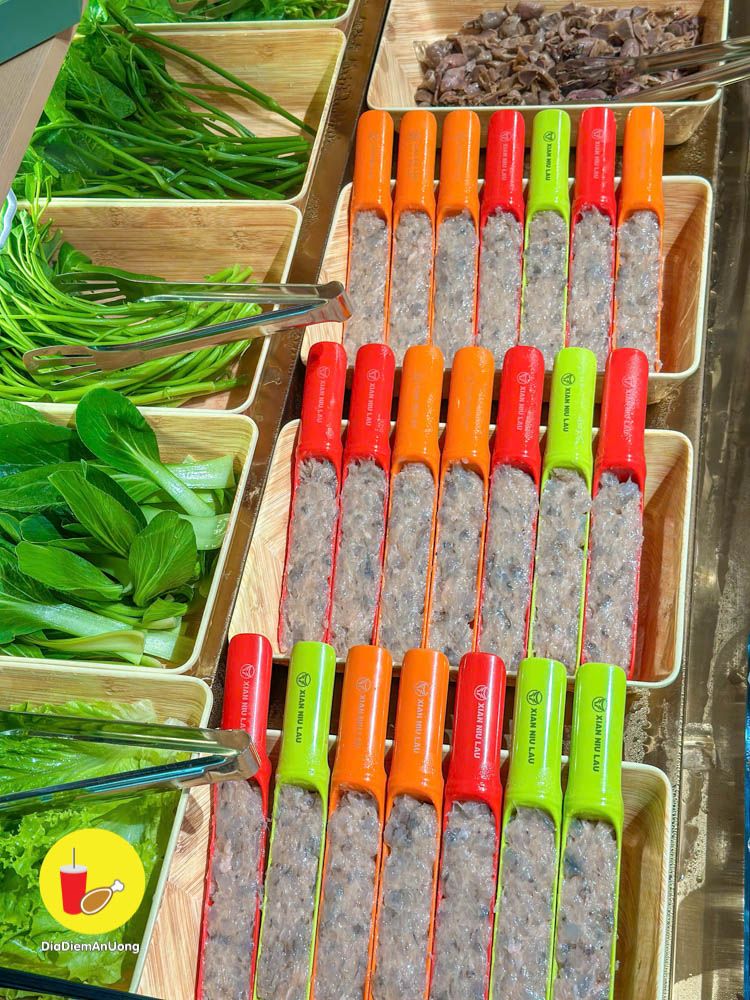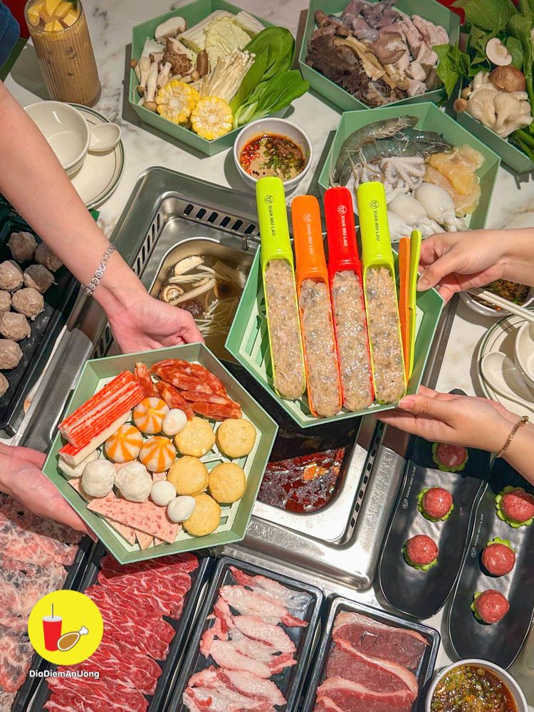 Khu vực các quầy line ta nói ê hề các loại từ thịt, lòng, các viên thả lẩu,....cho đến rau, nấm và đồ tráng miệng