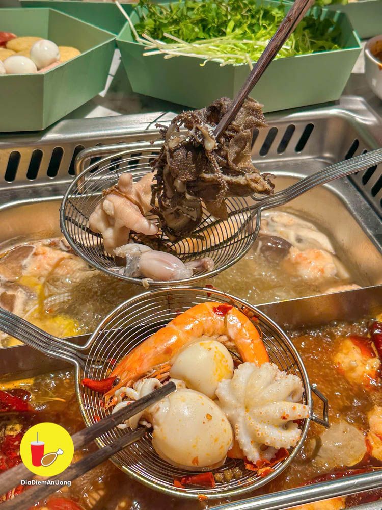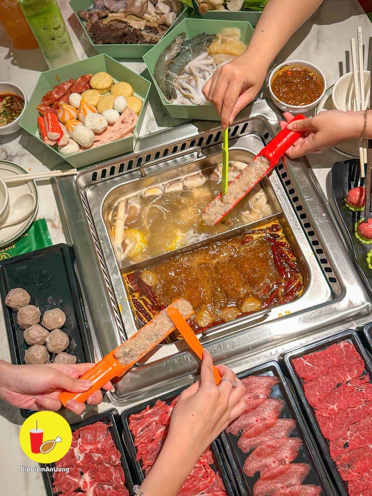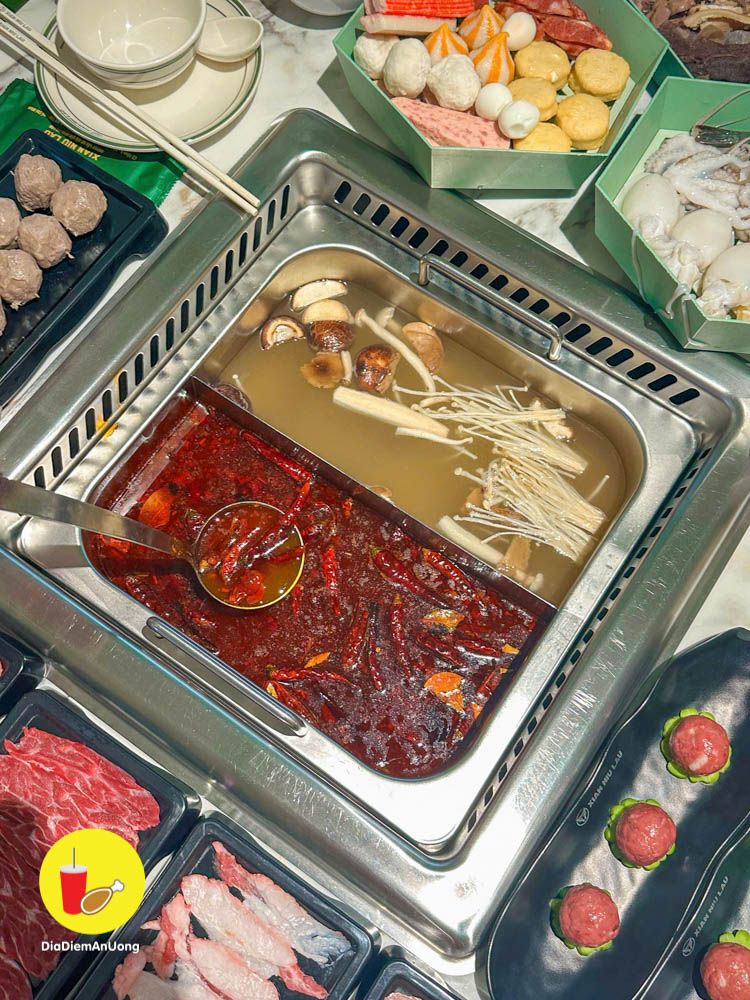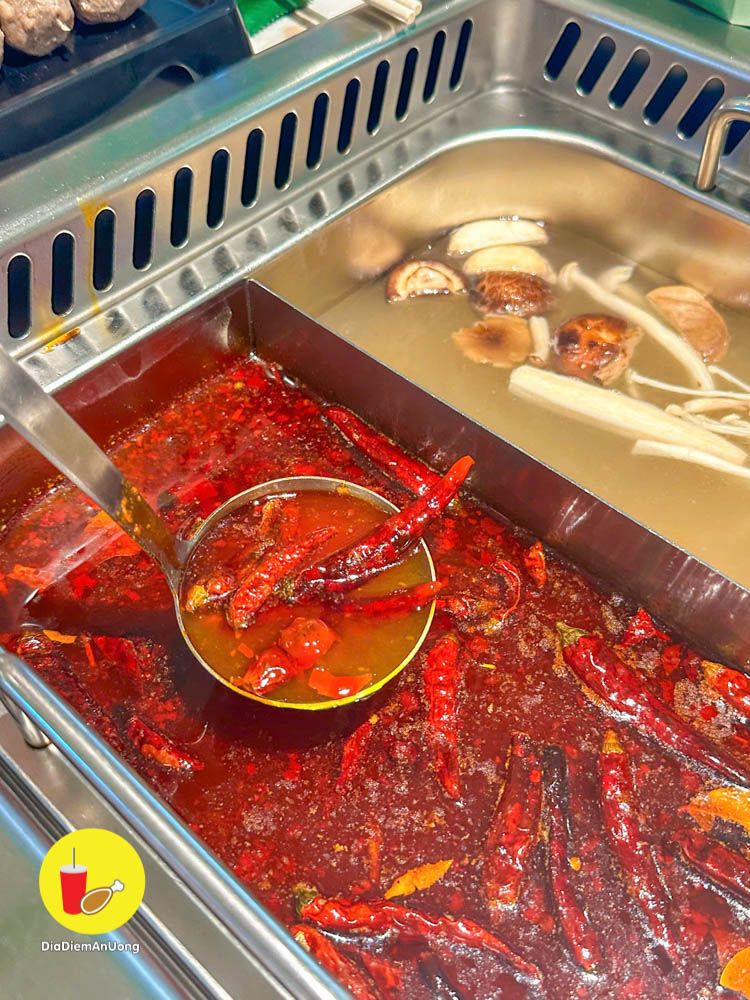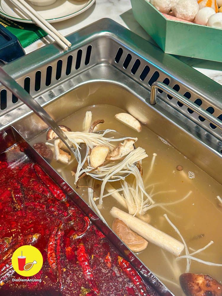 Về nước lẩu thì không hề kém cạnh, với hơn 10 loại. Nhưng nay tui gọi 2 vị đặc trưng nhất: Xuyên Tiêu cay thơm & Lẩu nấm thanh dịu