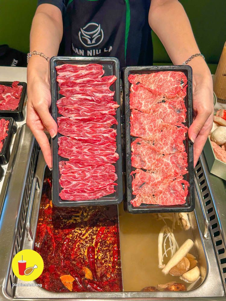 Tui thấy ở Xian Niu Lau có tới 9 loại thịt bò tươi khác nhau. Dĩa nào cũng đầy đặn, thịt thái miếng vừa ăn không quá mỏng đâu