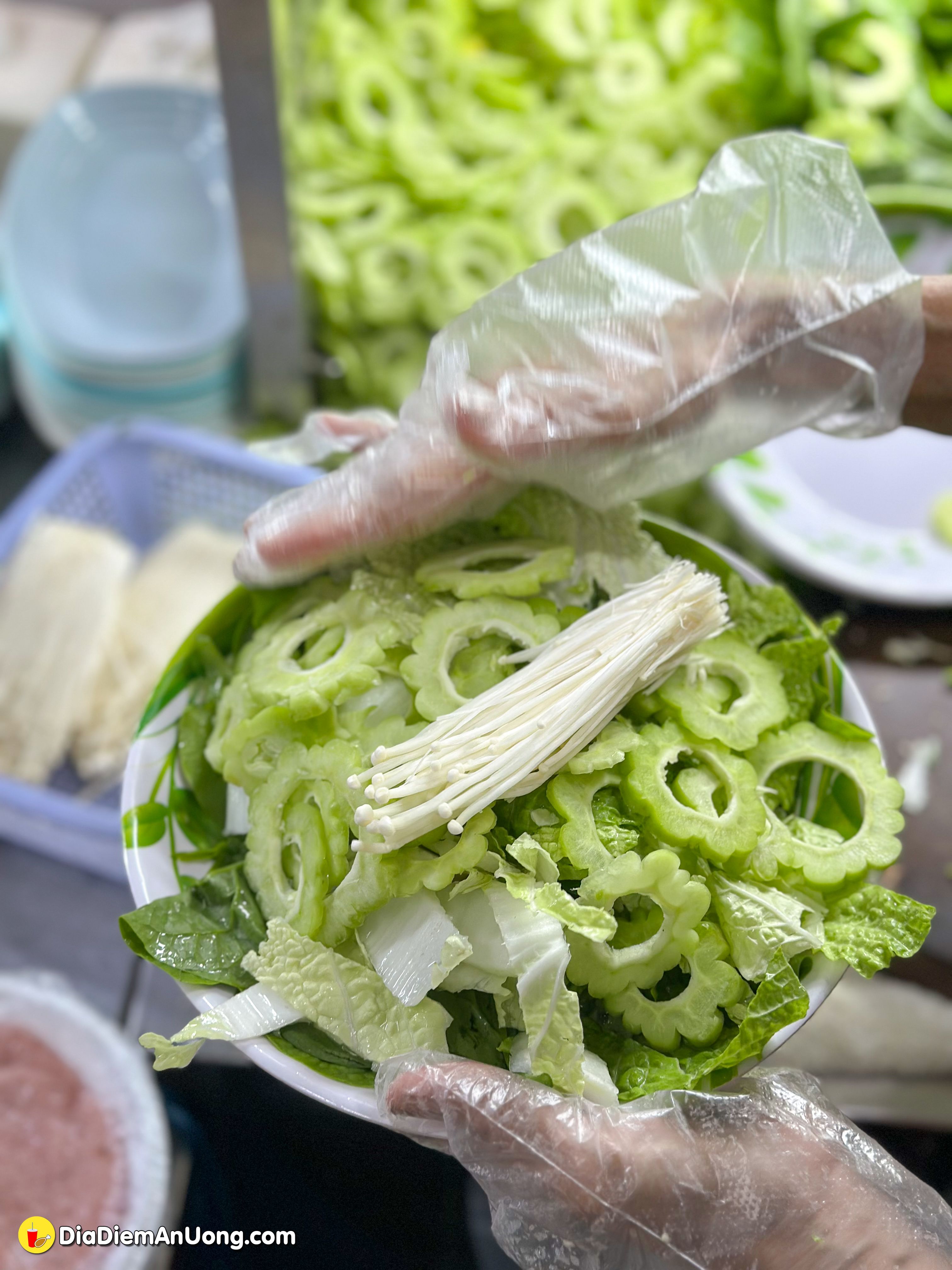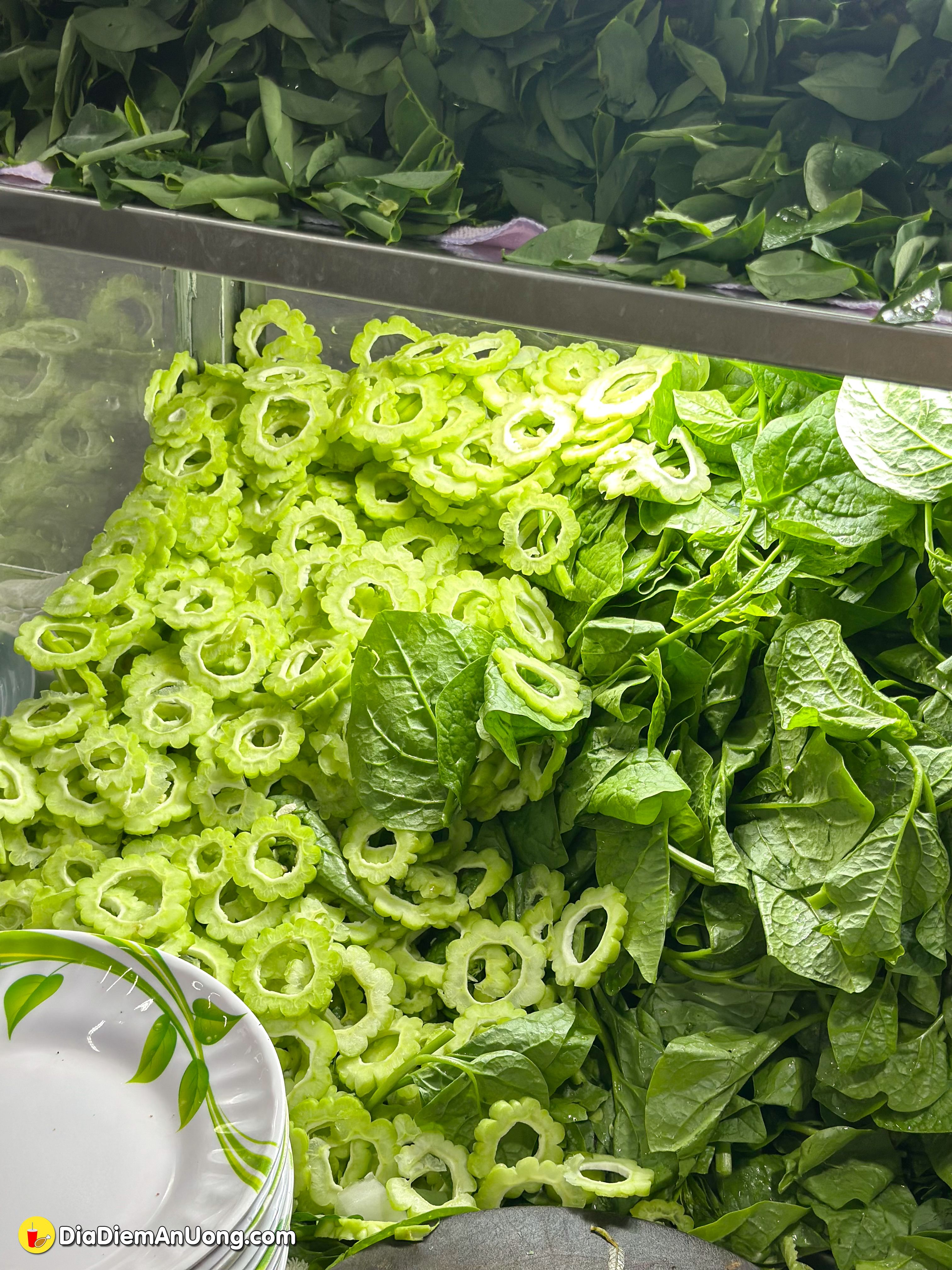 Điểm cộng to bự nhất của quán chính là cái quầy rau. Nhìn mà muốn "xỉu up xỉu down" vì quá nhiều và tươi. Khổ qua được bào mỏng, xếp thành đống cao ngất. Khổ qua tươi xanh, khi nhúng vào nồi lẩu cá thác lác sẽ tạo nên vị đắng nhẹ rồi ngọt hậu đặc trưng, đúng bài luôn!